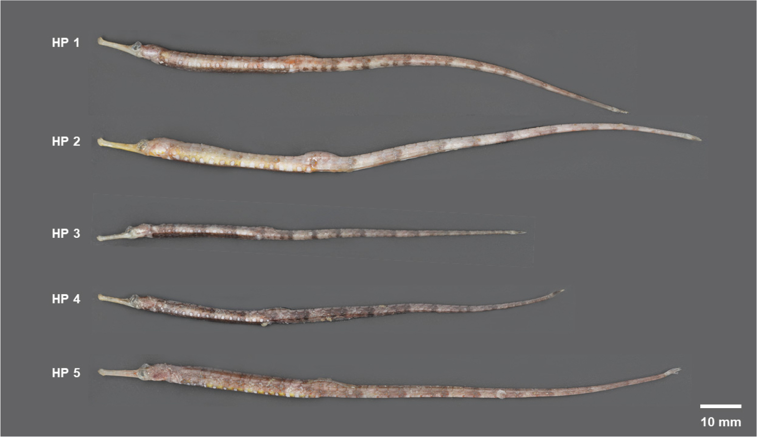 - Although larval stages of the starry pipefish, Halicampus punctatus, have previously been documented in the waters surrounding the Korean Peninsula, adult specimens have not yet been confirmed. Here, we report the first collection of five adult specimens from the eastern waters off Jeju Island and identify them using both morphological characters and COI sequence analysis. The specimens were identified as H. punctatus based on morphological features consistent with previous descriptions. The COI distance and maximum-likelihood (ML) analyses demonstrated that the present Korean specimens formed a clade with H. macrorhynchus, diverging from other members of the genus. This phylogenetic configuration directly challenges the monophyly of the genus Halicampus and necessitates a taxonomic revision. - COLLAPSE