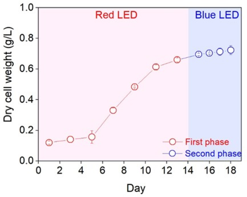 - Microalgae, such as Chlorella vulgaris, play a crucial role in aquatic ecosystems and have substantial industrial value because of their ability to produce various useful substances, including lipids and proteins. This study aimed to determine the more efficient culture system for improving the biochemical composition of C. vulgaris PKVL7422 by comparing two-phased (TPLC) and mixed LED light culture (MLC) systems using blue (λmax=450 nm) and red (λmax=660 nm) light. In the TPLC system, the highest protein and lipid contents were observed on day 17 of the second phase under blue light, with 1.5-fold and 1.6-fold increases in protein and lipid, respectively, compared to the first phase under red light. However, no significant difference was observed in the biological compositions compared to those measured during the stationary phase under monochromatic blue light. In the MLC system, a red-to-blue light ratio of 3:7 yielded higher protein and lipid contents than the other ratios. Notably, the protein content under these conditions was 1.7 times higher than the highest content observed on day 17 of TPLC. Thus, strains such as PKVL7422 may improve the efficiency and productivity of the biological composition through the MLC method using a 3:7 (red: blue) ratio. - COLLAPSE